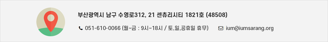 재단법인 이음    ㅣ    (48508)부산광역시 남구 수영로312, 21 센츄리시티 1821호   ㅣ    대표번호:051-610-0066   ㅣ    상담시간(월~금) 09:00~18:00